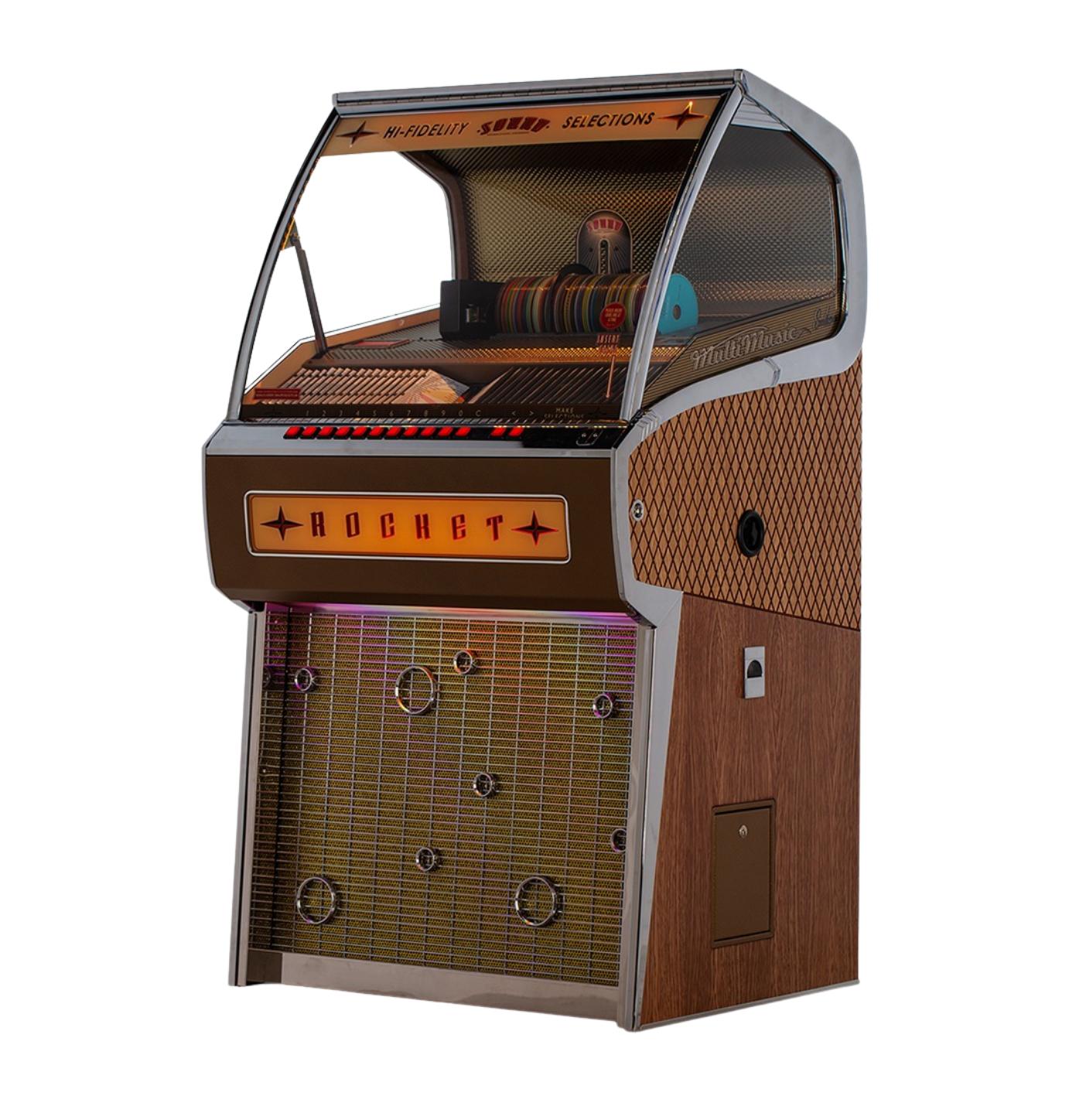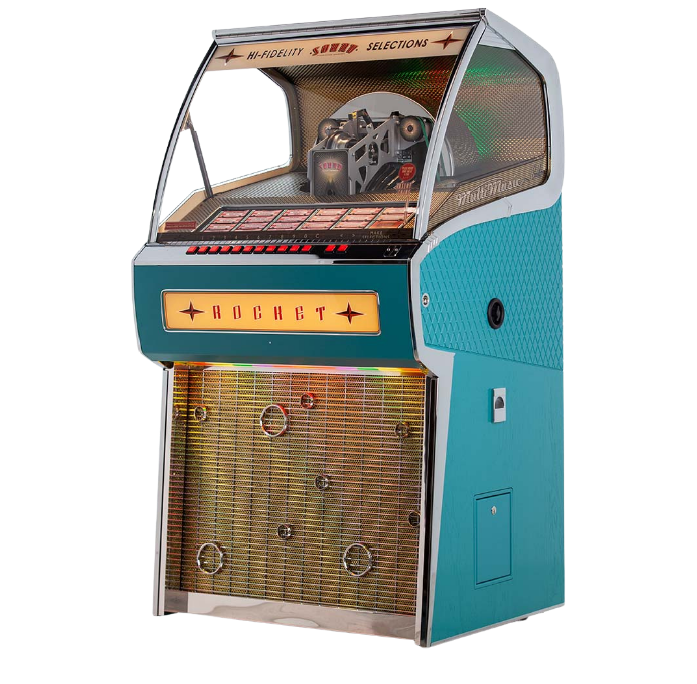 Bluetooth intégré, télécommande infrarouge et plateforme S3 Unity assurent une utilisation simple et moderne.MÉCANIQUE & TECHNOLOGIELe Rocket Vinyl Jukebox offre une immersion totale dans l’âge d’or du rock’n’roll. Entre spectacle mécanique du vinyle et sonorité chaleureuse, il crée une atmosphère rétro unique.EXPÉRIENCE & AUTHENTICITÉInspiré de l’âge d’or des jukeboxes américains, le Rocket séduit par ses lignes chromées, son verre galbé et son éclairage subtil. Disponible dans de nombreuses finitions et coloris, il s’intègre aussi bien dans un intérieur vintage que contemporain.Rocket CDleisureIcône absolue du style jukebox années 50, le Rocket CD Jukebox de Sound Leisure rend hommage à la naissance du rock’n’roll, tout en intégrant des technologies audio modernes.