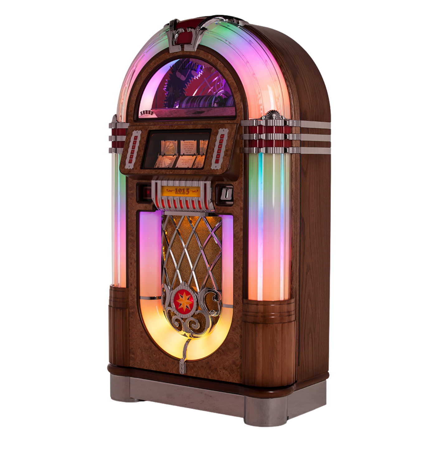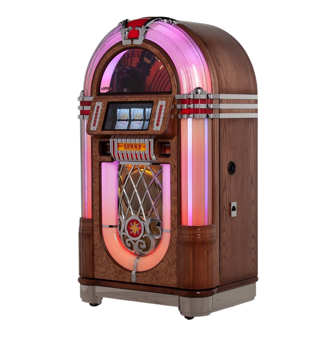 Chaque SL33 peut être personnalisé (finition, couleurs, options).CONFORT & PERSONNALISATIONLe SL15 CD rend hommage au design mythique des jukeboxes américains d’après-guerre : arche lumineuse, tubes à bulles champagne, chrome poli et cabinet en bois massif formé en une seule pièce. Chaque détail respecte les proportions et l’élégance du modèle original.SL15 CDBonziniDEVISIcône intemporelle inspirée du légendaire Wurlitzer 1015, le SL15 CD Jukebox réinterprète le jukebox classique des années 40 avec une technologie moderne et une qualité sonore haut de gamme. Entièrement fabriqué à la main au Royaume-Uni, il offre une expérience musicale authentique, élégante et fiable, aussi bien pour les particuliers que pour les lieux professionnels.DEVISACCUEILDESIGN & HÉRITAGEL’amplificateur SL-D4 et les haut-parleurs sur mesure offrent un son chaud, puissant et équilibré. L’éclairage LED Diamond Pack, inclus de série, permet de créer différentes ambiances lumineuses.SON & AMBIANCELe mécanisme S3 Unity CD permet de stocker 80 CD avec affichage complet des titres. Sélection via boutons ou télécommande, Bluetooth intégré et entrées auxiliaires pour diffuser votre musique depuis des appareils externes.SENSATIONS DE JEUInspiré du légendaire Wurlitzer 1015, le SL15 CD Jukebox s’impose comme une pièce centrale élégante et intemporelle. Il recrée l’ambiance des diners américains tout en offrant un confort d’utilisation moderne.EXPÉRIENCE & ÉLÉGANCE CLASSIQUEInspiré du mythique Wurlitzer 1015, le Rocket séduit par ses lignes chromées, ses éclairages LED et son design immédiatement reconnaissable.